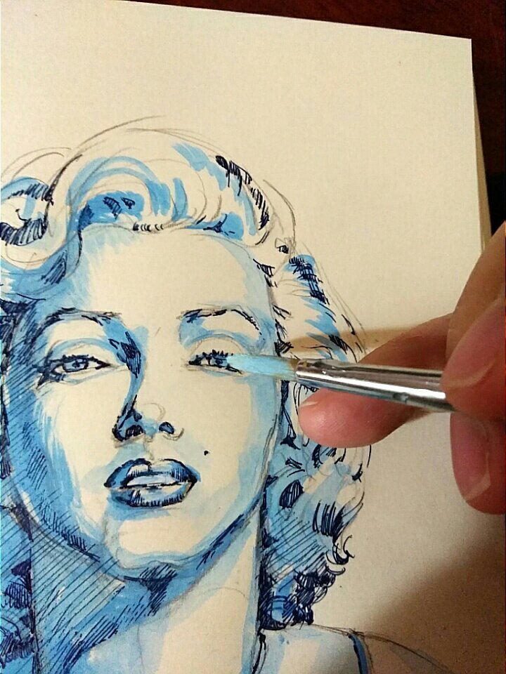 描き方・水彩絵の具一色とペン一本で描くマリリン・モンロー肖像画・塗り方コツ解説