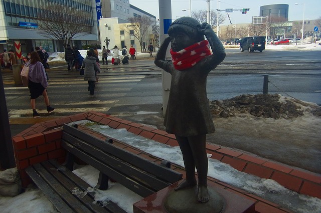 久々にプラス気温となり、春めいた陽射しの函館駅前。