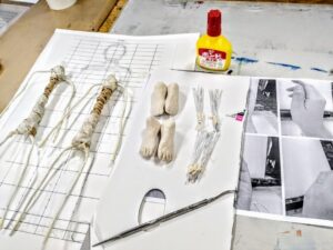 手と足の芯を作り、粘土を巻いていきます。