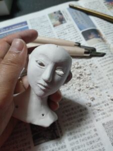 おおまかに顔を造形してから、彫刻刀で彫り込んでいます。